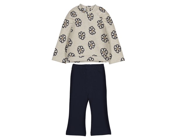 Conjunto felpa bebé niña. Compuesto de pantalón azul marino acampanado y sudadera beige con flores estampadas en marino. Un estilo muy chic para las más peques.
