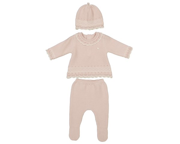 Conjunto de bebé de punto en tonos rosa enpolvado, compuesto por jersey pantalón y gorro a juego. Suave, cómodo y perfecto para los primeros días.