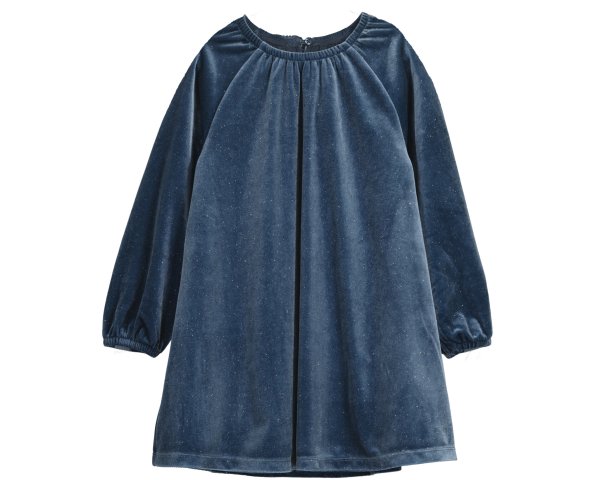 Vestido de niña en tejido de terciopelo azul, de manga larga con puños elásticos y cuello redondeado fruncido, de diseño holgado y cómodo. Siempre con la calidad de MAYORAL.