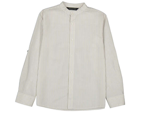 Camisa de rayitas en camel y blanco, de lino en manga larga con cuello mao. Ideal para un outfit moderno y actual. Siempre con la calidad de MAYORAL