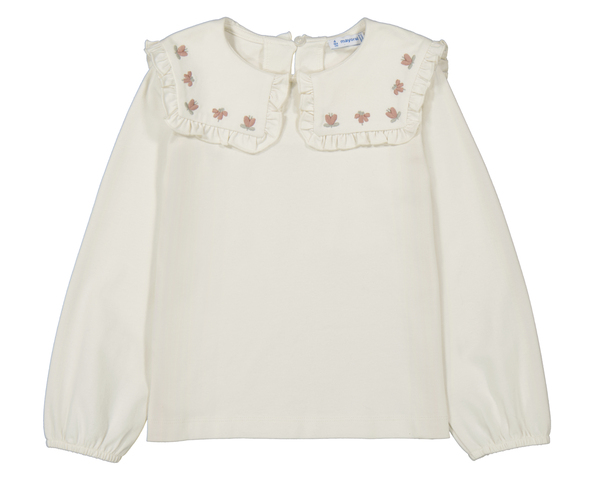 Blusa de niña en color blanco crudo, de manga larga con puños elásticos, cuello redondo con solapas decoradas con volantes y bordados florales en tonos rosa, cierre trasero con botón para mayor comodidad. Siempre con la calidad de MAYORAL.