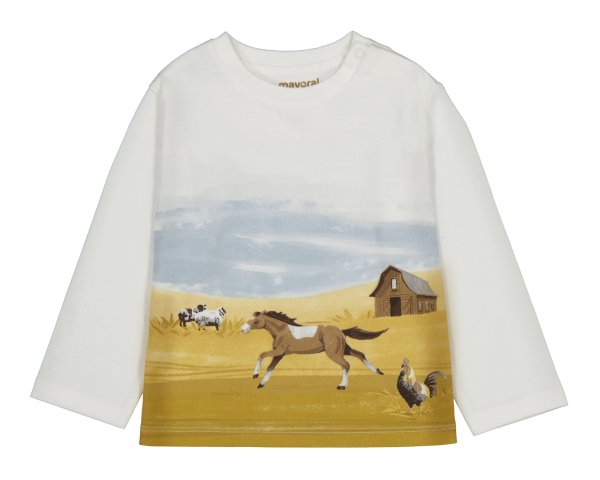 Camiseta de manga larga para bebé con estampado de caballos en un paisaje campestre. Suave, cómoda y perfecta para los pequeños amantes de los animales.