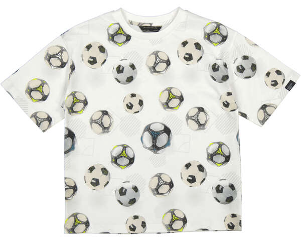 Camiseta blanca de algodón en manga corta y con cuello redondo con divertidos balones de futbol serigrafiados.  Siempre con la calidad de MAYORAL.