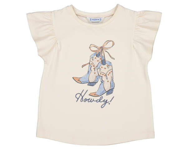 Camiseta de algodón en manga sisa con volante y cuello redondo, serigrafiada con una botas de caowoy  en el delantero recordandonos que pronto se acercan las vacaciones. Siempre con la calidad de MAYORAL.