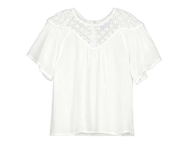 Camiseta con mangas ablusadas y encaje en el cuello. Ideal para ceremonia. Siempre con la calidad de MAYORAL.