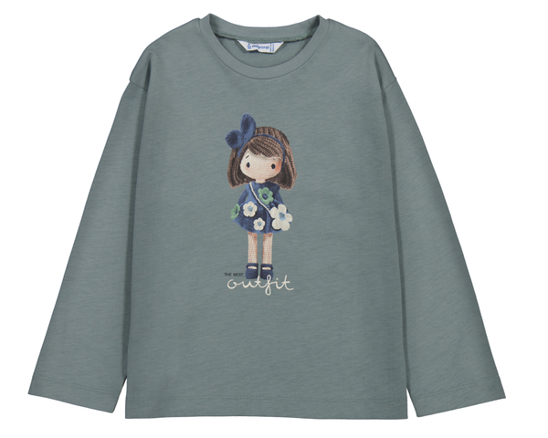 Camiseta de niña con manga larga y cuello redondo, adornada con una dulce muñeca. Ideal para combinar con cualquier tipo de pantalón tejano. Siempre con la calidad de MAYORAL