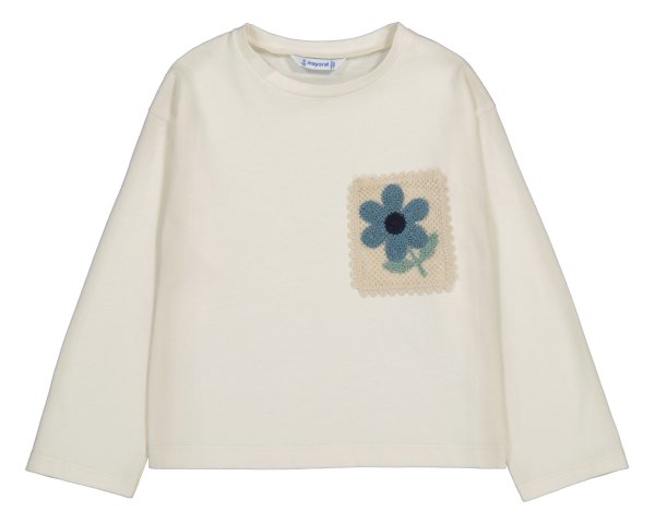 Camiseta de algodón y manga larga con cuello redondo, con adorno en bolsillo frontal de una flor verde. Ideal para vestir cómoda y práctica. Siempre con la calidad de MAYORAL.