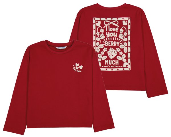 Camiseta infantil niña roja de manga larga y cuello redondo con serigrafiado en la espalda en tonos de beige. Ideal para cualquier ocasión. Siempre con la calidad de MAYORAL.