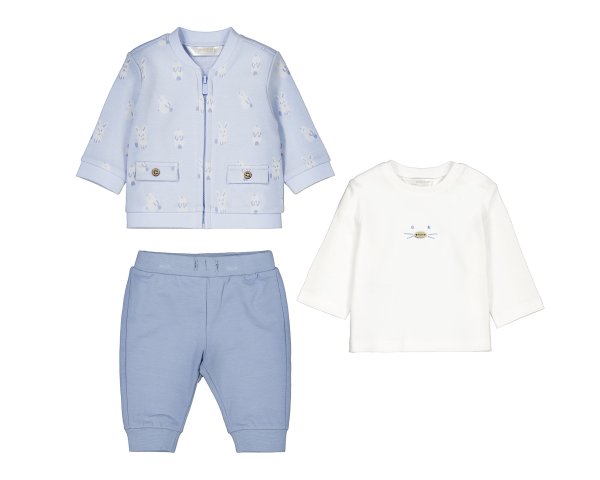 Chandal compuesto por tres piezas. Pantalón en color celeste con elástico en la cintura y puños, camiseta de manga larga y apertura lateral con simpático estampado de gatitos  y por último una sudadera en color crema celeste con cremallera para mayor comodidad a la hora de vestir a nuestro bebé. Siempre con la calidad de MAYORAL.