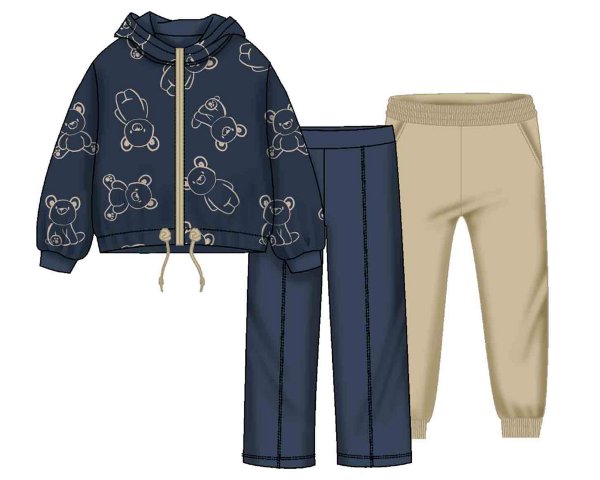 Chandal de niña en algodón que incluye una chaqueta azul marino con capucha y delicados adornos en beige, acompañada de dos pantalones, uno beige con puño en el bajo y cintura elástica para mayor comodidad, y otro azul marino, sin puño, de estilo más formal. Ideal para combinar confort y estilo en cualquier ocasión. Siempre con la calidad de MAYORAL.