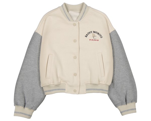 Chaqueta estilo varsity en tonos crema y gris, con botones al frente y mangas abombadas. Lleva el texto “SAINT MORITZ FC” y cinco estrellas bordadas en el pecho. Diseño casual con inspiración deportiva. Siempre con la calidad de MAYORAL.