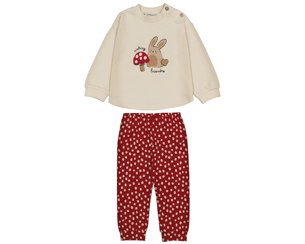 Conjunto de bebé niña con pantalón rojo de topitos beige y sudadera beige de cuello redondo, con botones laterales. Incluye un tierno estampado de conejito con una seta, ideal para un look dulce y cómodo.
