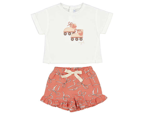Conjunto niña compuesto de pantalón corto estampado con volante y camiseta de algodón serigrafiada. Ideal para los días de verano. Siempre con la calidad de MAYORAL.