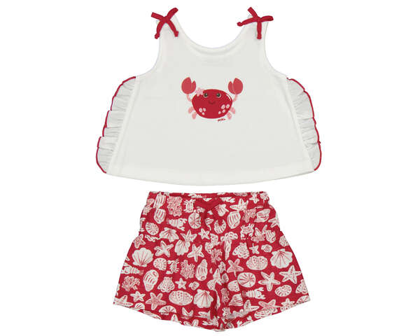 Conjunto compuesto de pantalón corto estampado con cordón en la cintura y camiseta de tirantes con lacitos. Ideal para los días de verano. Siempre con la calidad de MAYORAL.