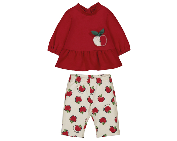 Comjunto de punto muy cómodo compuesto por sudadera roja con volante y pantalón estampado de manzanas a juego. Ideal para cualquier ocasión. Siempre con la calidad de MAYORAL.
