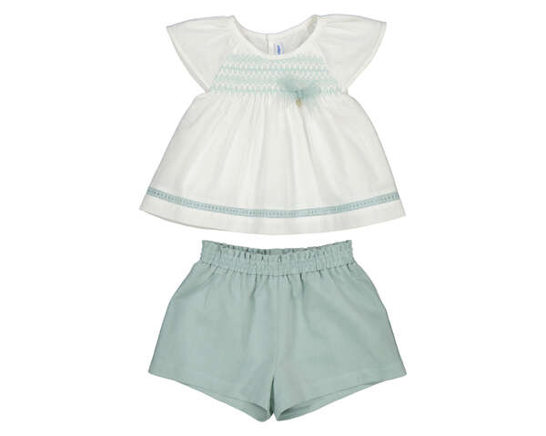 Conjunto infantil de dos piezas en tonos suaves: blusa blanca con detalles en  verde agua y manga volante, combinada con short verde agua. Ideal para verano Siempre con la calidad de MAYORAL.