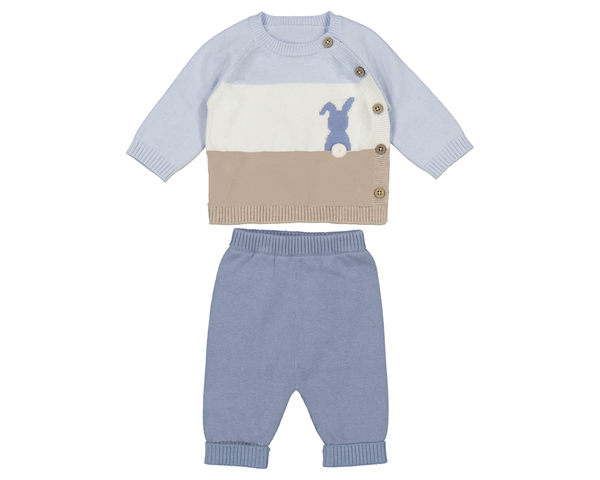 Conjunto forfamo por pantalón muy calentito en tono azul con elástico en cintura y puños, compañero a un jersey en tres tonos y apertura lateral abotonada. Siempre con la calidad de MAYORAL.