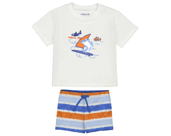 Conjunto niño compuesto por dos piezas compuesto por camiseta de algodón de manga corta y un bañador tipo boxer compañero. Ideal para los días de baño. Siempre con la calidad de MAYORAL.