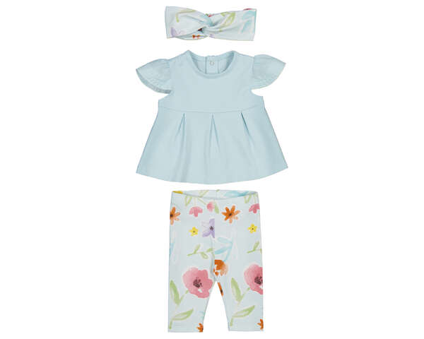Conjunto de 3 piezas compuesto por unas cómodas leggings con divertido estampado, una camisa celeste con volante en la manga y una felpa ancha para completar el outfit. Ideal para el día a día. Siempre con la calidad de MAYORAL.
