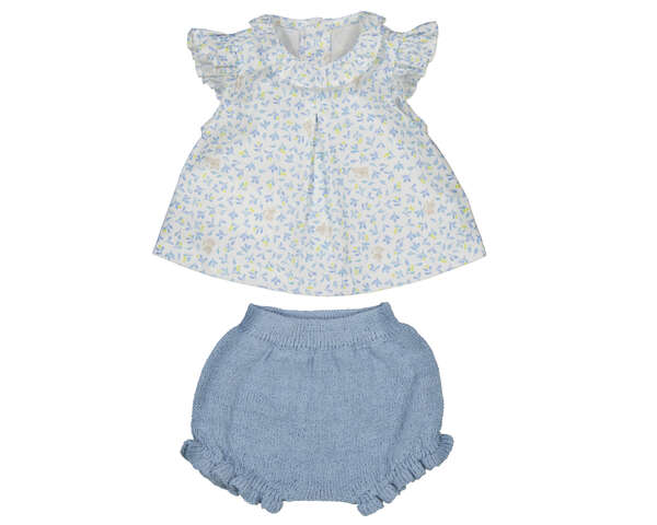 Conjunto de pololo de punto con camisa estampada en manga sisa y volante en el cuello. Ideal para cualquier ocasión. Siempre con la calidad de MAYORAL.