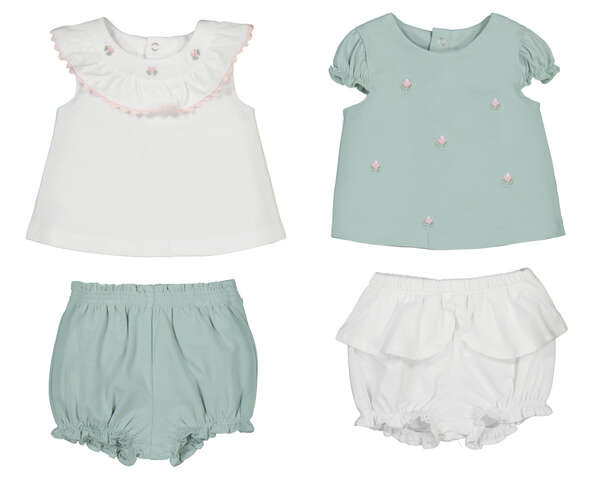 Conjunto infantil dulce y elegante, compuesto por dos blusitas de manga corta con delicados detalles y dos cubrepañal a juego que se combinan entre sí. Ideal para los días de verano, cómodo, fresco y perfecto para ocasiones especiales o el día a día. Siempre con la calidad de MAYORAL.