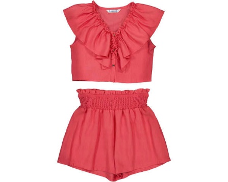 Conjunto compuesto por dos piezas, un pantalón corto con cintura fruncida y un top con volante decorativo del mismo color. Ideal para los días de verano. Siempre con la calidad de MAYORAL.
