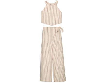 Conjunto compuesto por pantalón ancho fluido con lazo de rayas en tonos de beige y top compañero en manga sisa. Ideal para los eventos de verano. Siempre con la calidad de MAYORAL.