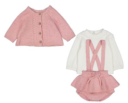 Conjunto tricot compuesto de tres prendas, una chaquetita de punto abotonada y con manga larga en tono rosa, compañera a una ranita  con volante y tirantes, además lo complementa una camiseta de manga larga en beige. Un look ideal para ocasiones especiales. Siempre con la calidad de MAYORAL.