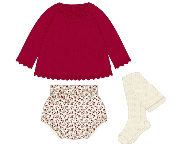 Conjunto compuesto de tres piezas. Suave jersey en rojo con manga larga, cuello redondo y onditas en los puños y cintura. Lo acompaña una preciosa braguita estampada en tonos de verde y rojo con fondo beige, además trae su leotardo a juego. Ideal para cualquier ocasión. Siempre con la calidad de MAYORAL.