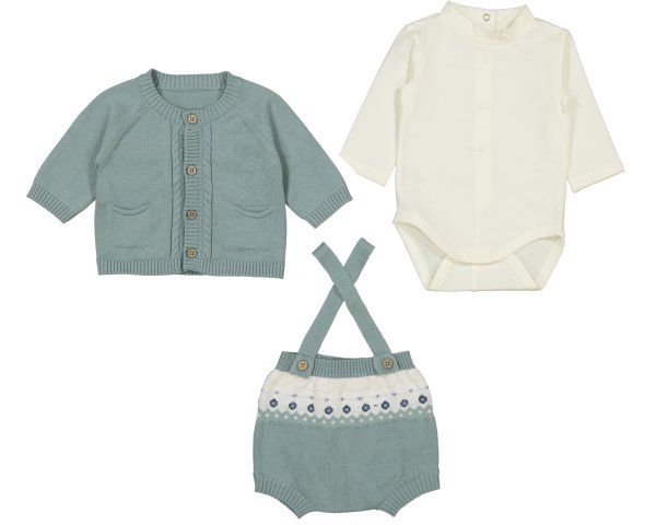 Conjunto  tricot de tres piezas, compuesto por  ranita corta combinada en verse suave y beige, body de manga larga con cuello en beige y chaquetita en verde liso. Ideal para que los más peques de la casa tambien luzcan elegantes. Siempre con la calidad de MAYORAL.