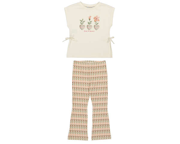 Conjunto compuesto por pantalón estampado de punto y acampanado con camiseta de manga corta compañera. Un conjunto muy original y divertido para los días de verano. Siempre con la calidad de MAYORAL.