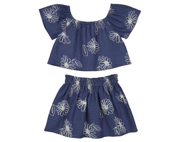 Conjunto compuesto de falda de vuelo con flores bordadas sobre fondo azul marino y top compañero. Ideal para cualquier ocasión. Siempre con la calidad de MAYORAL.