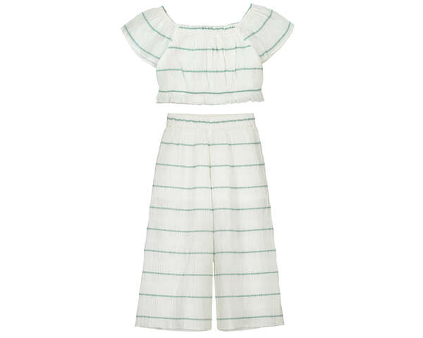 Conjunto de pantalón fluido con top compañero de rayas verdes finas sobre fondo blanco. Ideal para un outfit casual. Siempre con la calidad de MAYORAL.