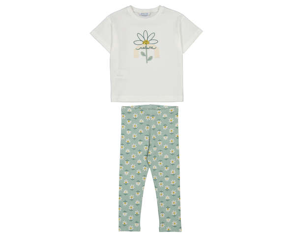 Conjunto de leggins estampadas con margaritas sobre fondo verde y camiseta compañera de algodón. Ideal par el día a día. Siempre con la calidad de MAYORAL.