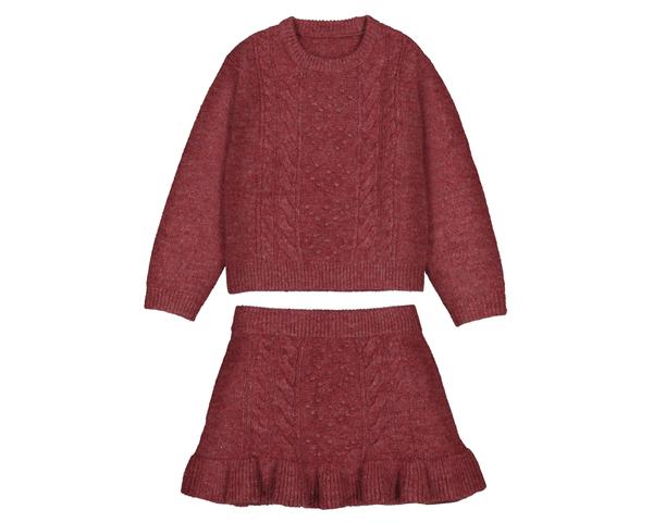 Conjunto tricot compuesto de una faldita de lana con volante y cinturilla elástica y su jersey compañero. Ideal para ir perfectas y calentitas. Siempre con la calidad de MAYORAL.