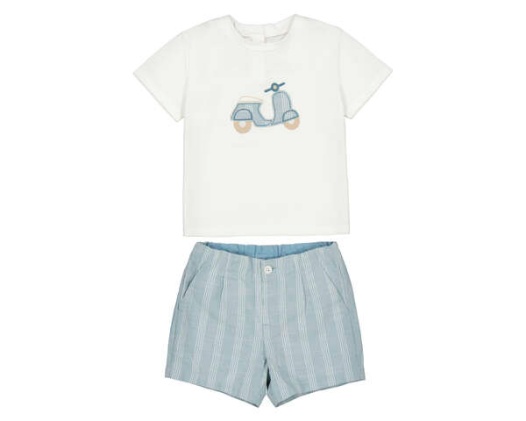 Conjunto infantil de verano: camiseta blanca con dibujo de scooter y pantalón corto de rayas en tono azul claro. Fresco, cómodo y perfecto para el día a día. Siempre con la calidad de MAYORAL.