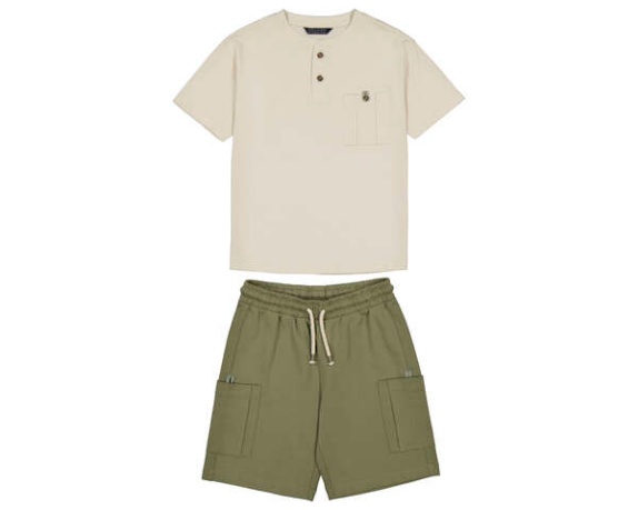 Conjunto de punto compuesto por un pantalón corto de algodón con bolsillos laterales y cordón en la cintura y una camiseta básica con cuello redondo y abotonada. Siempre con la calidad de MAYORAL.
