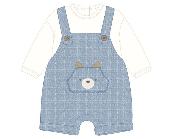 Conjunto compuesto por peto en cuadritos azul y blanco, con simpático bolsillo en forma de gatito, lo acompaña su camiseta compañera en color blanco con cuello redondo y manga larga.  Siempre con la calidad de MAYORAL.