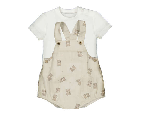 Peto compuesto de dos piezas, una ranita con un divertido estampado de ositos y camiseta de algodón básica. Cómodo y ligero para las tardes de verano. Siempre con calidad de MAYORAL.