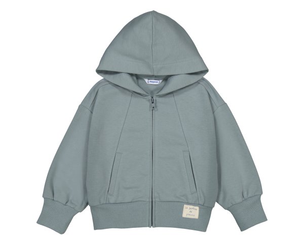 Sudadera de niña en tono verde suave, con capucha, cremallera y bolsillos frontales. Muy ponible y cómoda. Ideal para los días de deporte. Siempre con la calidad de MAYORAL.
