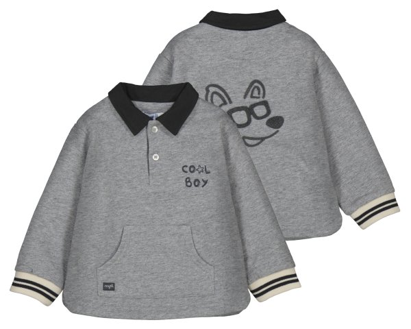 Suéter gris de manga larga para niño, con cuello polo negro, bolsillos frontales, puños con rayas y diseño “COOL BOY” al frente y dibujo de perro con gafas en la parte trasera. Siempre con la calidad de MAYORAL.