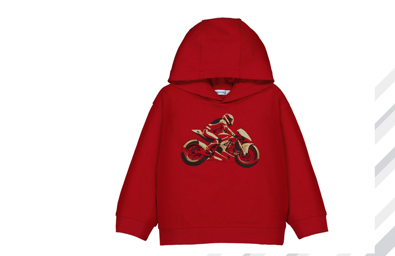 Sudadera roja con capucha y puños elásticos, lleva serigrafiada una moto de carreras en tonos camel y oscuro. Muy chula para nuestros chicos que empiezan a decantarse por un hobbie. Siempre con la calidad de MAYORAL.