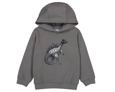 Este producto es una sudadera con capucha para niño, de color gris oscuro. En la parte frontal presenta un dibujo de un dinosaurio tipo estegosaurio, con detalles en blanco que destacan sobre el fondo oscuro. La sudadera tiene un diseño clásico con capucha, mangas largas y puños acanalados en las mangas y la parte inferior, lo que proporciona un ajuste cómodo. Es ideal para el uso diario y para los pequeños amantes de los dinosaurios.