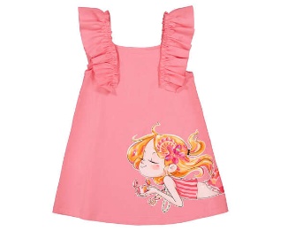 Vestido de punto rosa con volante en la sisa y muñeca estampada en el delantero. Ideal para los días de verano. Siempre con la calidad de MAYORAL.