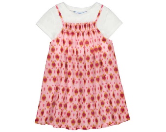 Vestido infantil de estilo veraniego con camiseta blanca de manga corta integrada y sobrevestido rosa estampado. Diseño ligero, con tirantes finos y corte amplio para mayor comodidad y frescura. Ideal para el día a día. Siempre con la calidad de MAYORAL.
