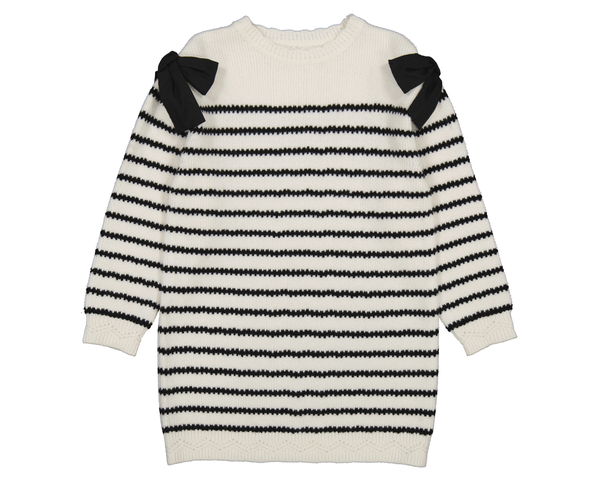 Vestido de punto en beige con rayitas horizontales en negro y unos lacitos adornando los hombros. Ideal para que nuestras niñas vayan abrigaditas en los días fríos. Siempre con la calidad de MAYORAL.