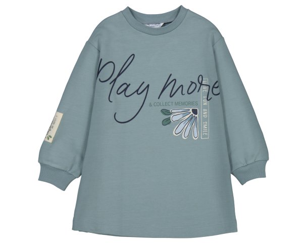 Vestido tipo sudadera para niña con diseño floral bordado y mensaje «play more». Cómodo, moderno y perfecto par el día a día. Siempre con la calidad de MAYORAL.